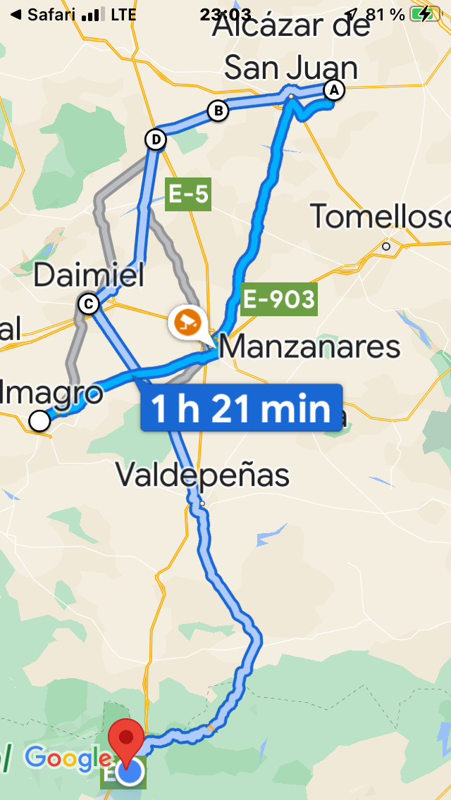 Después de 700 kilómetros de ruta tocaba volver, decidimos comer en Puerto Lápice para luego continuar con nuestro camino pasando por pueblos como Daimiel.