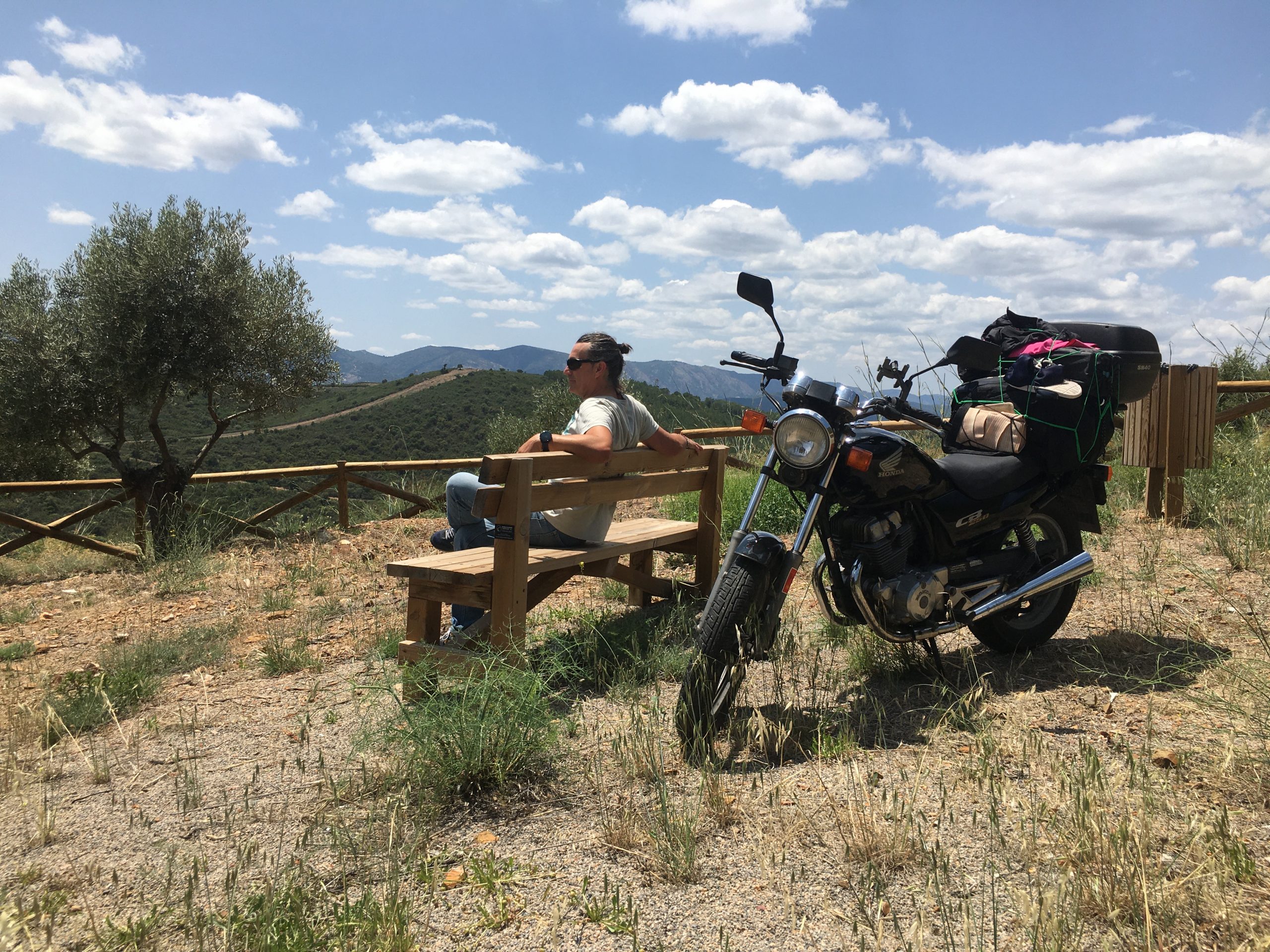 Al pasar la frontera de Castilla la carretera mejoró por lo que las motos lo agradecieron aunque había mucha gravilla en el piso y eso nos hizo retrasarnos. Continuamos el camino y nos paramos en un lugar llamado mirador de Mestanza donde se podía contemplar el Valle de Alcudia y la Sierra Madrona, al parar las motos me impactó el increíble silencio y la paz que desprendía el lugar además de las vistas.